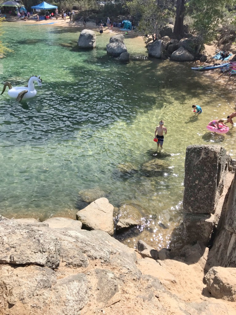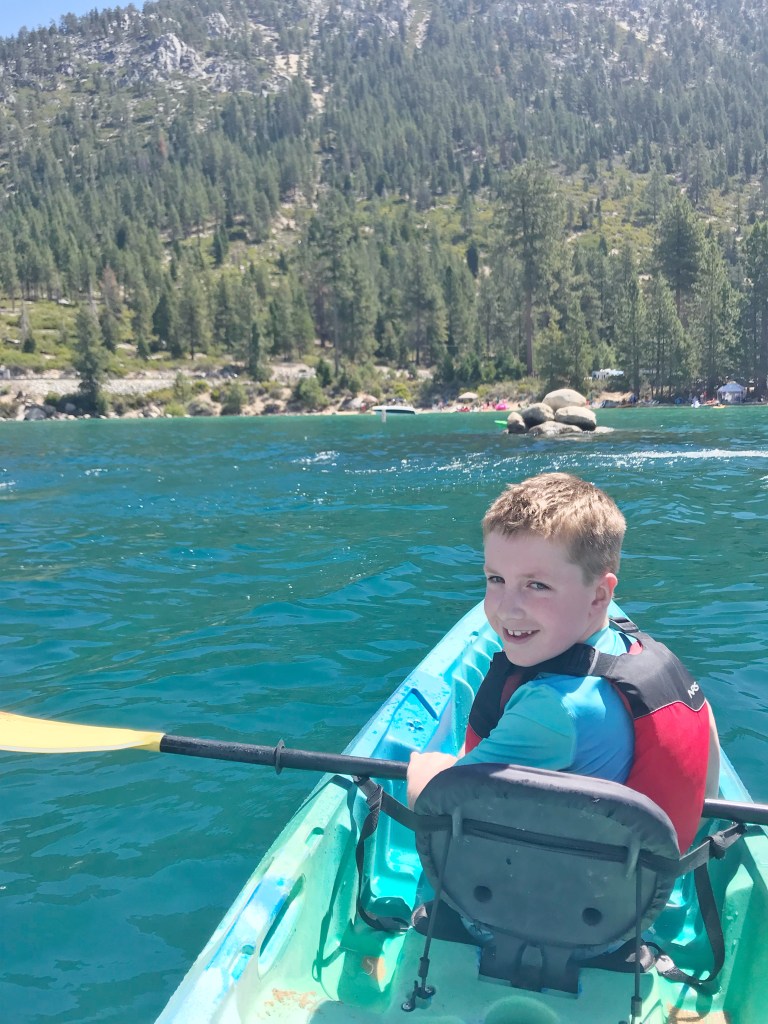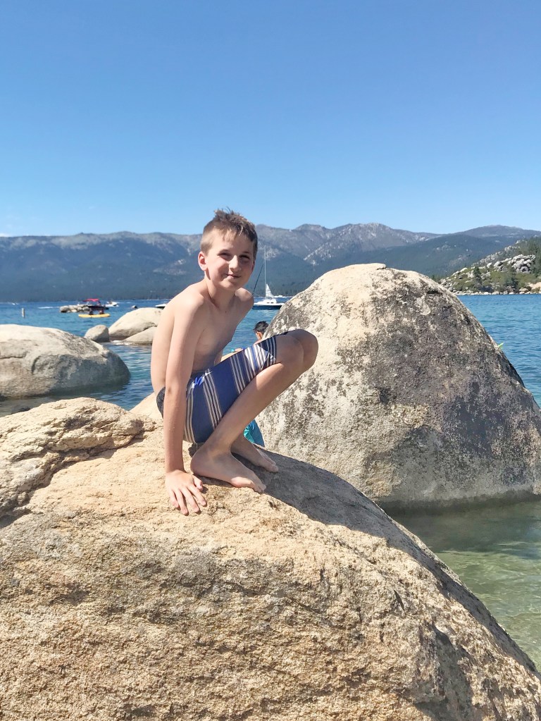 And we were happy to have him be this way… for the most part. But here at Lake Tahoe it was especially out of control. Every time we took our eyes off him, he was sneaking to the other side of the rock coves, getting too close to a cliff, going out too far in the water trying to spear fish. Upon arrival, he wanted to go into the freezing water with his clothes on. He wanted to inspect the trees and take bark samples. He wanted to dig in the ground and look for insects. He wanted to kayak. I wanted to kayak too, so we went. He wanted to jump off the rocks. So he and I went to the big rocks.