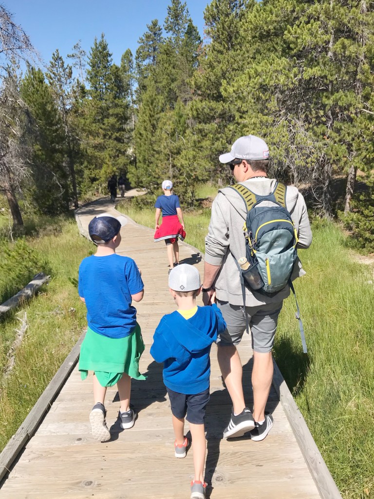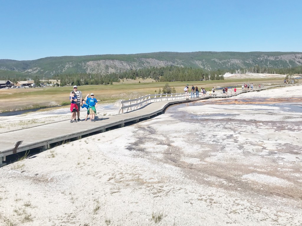 We had heard the the geyser trail was a better bet than waiting on Old Faithful if you were short on time and/or had kids. We were both of those things. So, we did that. You walk along a slightly precarious walkway in and among hot springs, geysers (which Finn kept pronouncing “juysers”), and sulfur pits. By precarious, I mean that there are signs that say “if you step off this pathway, you may fall into a hot pit.”
