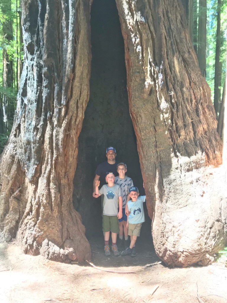 I asked the boys to all come over by the “Big Tree” sign for a picture. The big boys made it over. Then Theo, who was walking along the path shouted “Here comes the star!” and proceeded to jump and trip over some roots and land face down on the path. A mouth full of dirt, wood chips in his shirt pockets and two skinned knees kinda fall…