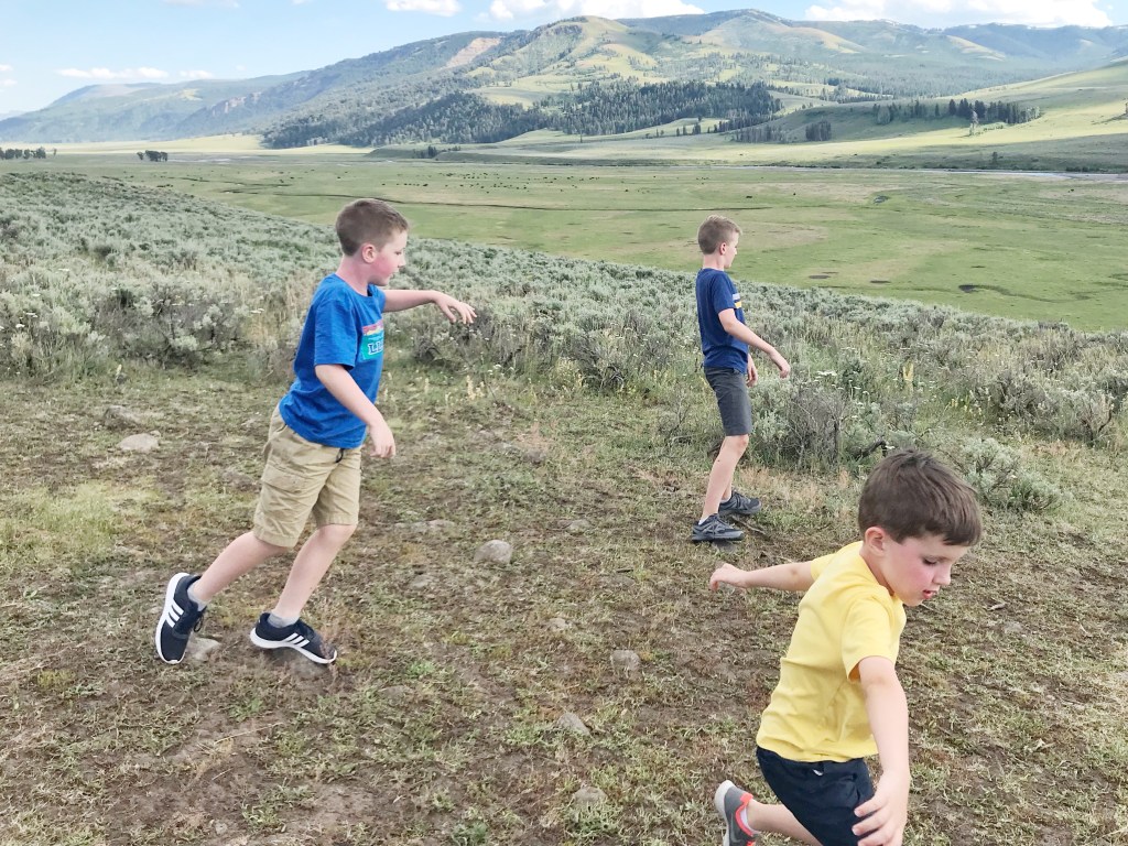 THAT’S RIGHT. A grizzly bear mama and two cubs. It’s very rare, from what I understand. People wait and hope for days to see a bear in Yellowstone. And three just sauntered right in front of our car. We were in so much shock that I didn’t get a picture. But I did get a video.