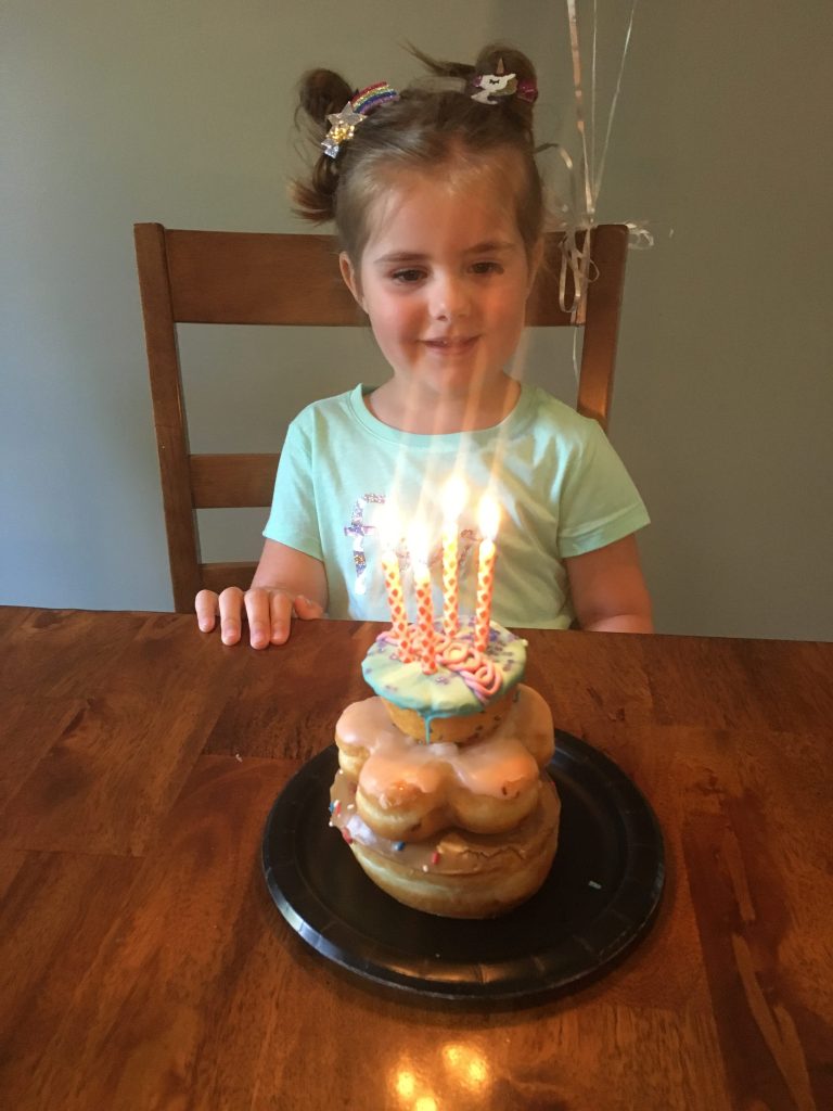 We poured ourselves into bed in Idaho. We got up bright and early the next morning to clean the windshield and then drive to our friend’s house near Portland. This day also happened to be princess’s official birthday, and she was spoiled by family accordingly – first by Aunt Erika with a custom made glitter “four” shirt and donuts, then by Grandma Susie with a bike, and by Great Aunt Patty who brought over a homemade cherry pie – because that is what Vivian had requested.